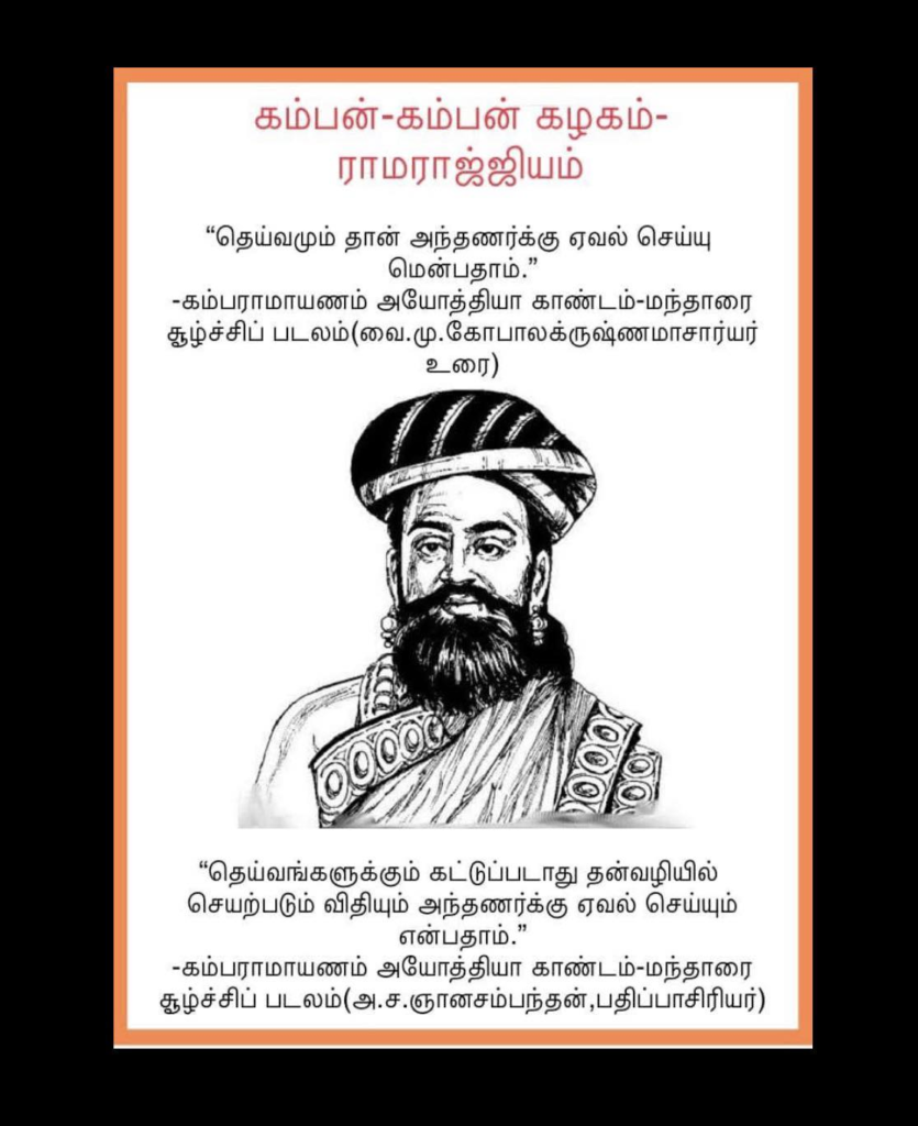 தமிழை வளர்க்கிறோம் எனும் பெயரில் பிராம்மணர்களின் ஆதிக்கத்தை வளர்ப்பது கம்பன் கழகம் போன்ற இலக்கிய மன்றங்கள்தான்.தமிழை விரும்பி,கம்பனின் கவிதைகளில் மயங்கி அதன் விளைவாக உள்நோக்கம் கொண்ட கம்பன் கழகத்தில் இணைந்து, பிராம்மண உயர்வை ஏற்று பட்டிமன்றத்தில் மதிமயங்கிப் போனவர்களே அதிகம்.இதன் விளைவாக ராமராஜ்ஜியம் போன்ற ஆபத்தான விசயங்களை ஆதரிக்கும் மனப்போக்கு அதிகரித்து வருகிறது.