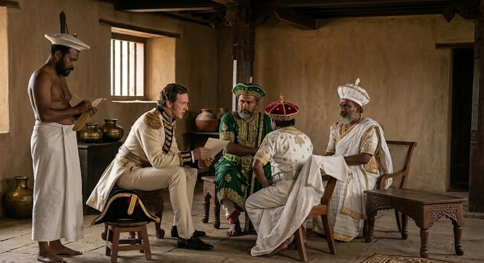 படம்: கண்டி அரசு பிரித்தானியர் கைகளில் வீழ்ந்த பின்னர் 1816.03.19 அன்று பிரித்தானிய அலுவலர் யோன் டி ஒயிலிக்கும், கண்டி அரசை வீழ்த்த உதவிய சிங்களப் பிரதானிகளான எகலப்பொலை, மொல்லிகொடை, கப்புவத்தை ஆகிய மூன்று அதிகாரங்களுக்கும் இடையே இடம்பெற்ற முதன்மையான அரசுசூழ்கை கலந்துரையாடலைச் சித்தரிக்கும் கோட்டு வரைபடம். செய்தெண்மை (AI) உதவியுடன் புகைப்படமாக்கப்பட்டது.
