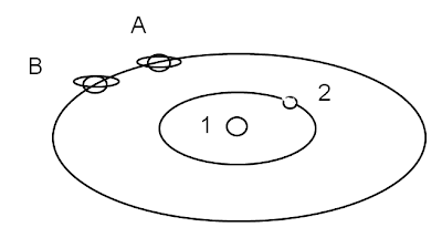| சனி கிரகம் A என்ற இடத்திலிருந்து B என்ற இடத்துக்கு நகர்ந்துள்ளது – இதுவே சனிப் பெயர்ச்சியாகும். இப்படத்தில் 1. சூரியன். 2. பூமி. |