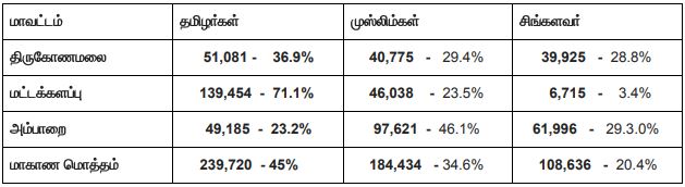 அதே வேளை மிக முக்கியமாக தமிழ் மக்களின் சனத்தொகை 1963 இல் 45% இல் இருந்து 2018 இல் 38% ஆக மாறியதோடு அதிகூடிய சனத்தொகையாக இருந்த தமிழ் மக்கள் தற்போது இரண்டாவது நிலைக்கு தள்ளப்பட்டுள்ளனர் . தற்போதைய சனத்தொகை வளர்ச்சி விகிதத்தை வைத்து பார்க்கும் போது தமிழ் மக்களின் சனத்தொகை வளர்ச்சி வீதம் வருடத்திற்கு 1.5 % மும், முஸ்லிம் மக்களின் சனத்தொகை வளர்ச்சி விகிதம் வருடத்திற்கு 2 % மும் ஆகவுள்ளது . இந் நிலை தொடருமாயின் ஒரு குறிப்பிட காலப்பகுதியில் தமிழ் மக்களின் சனத்தொகை 35% ஆக மாறக்கூடிய வாய்ப்புகள் தென்படுகின்றது .