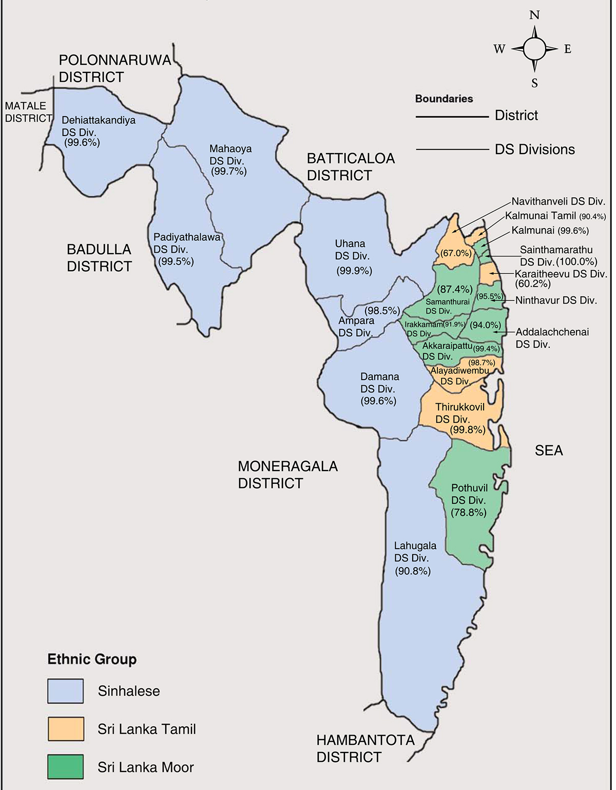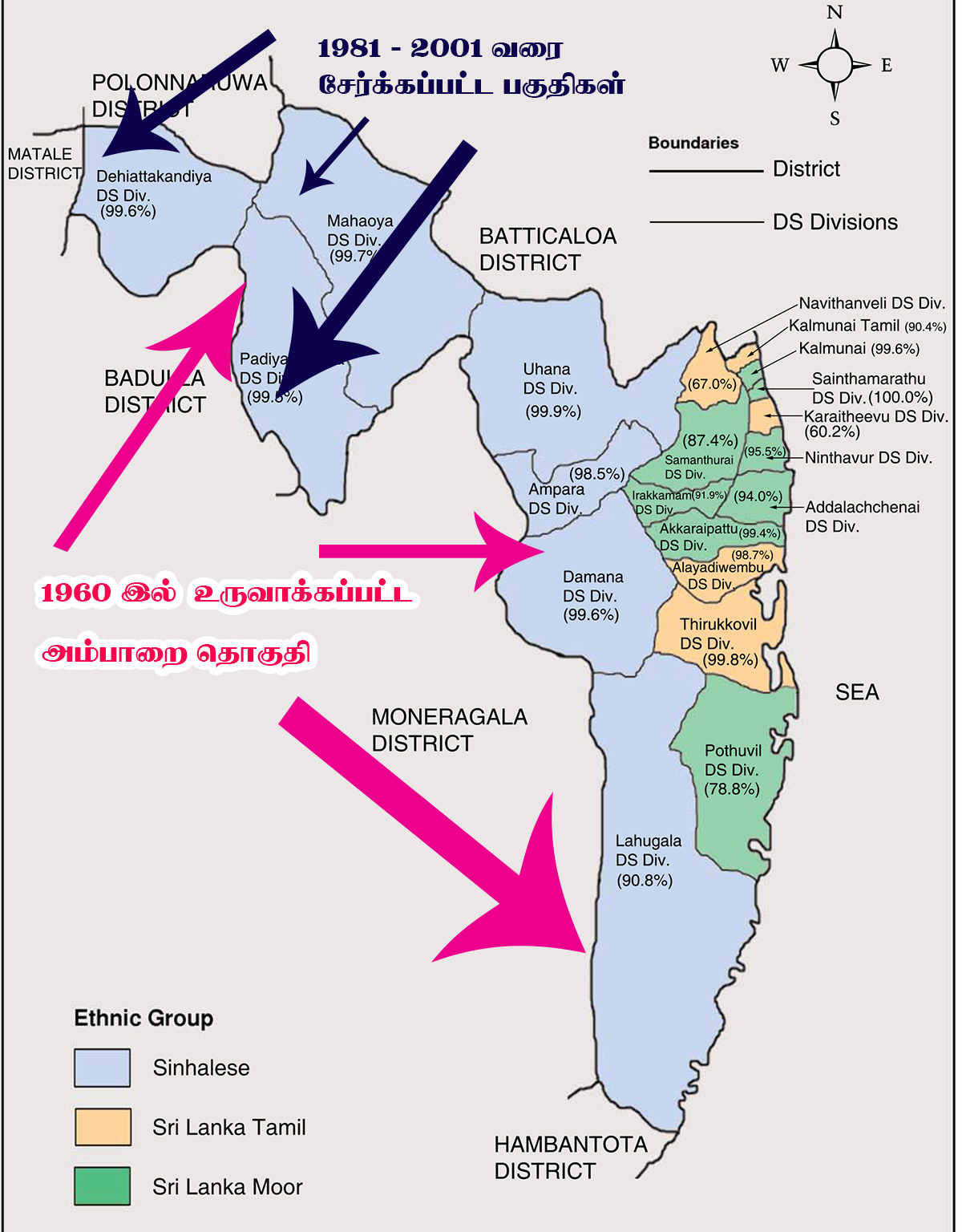 சிங்கள மக்களை பொறுத்தளவில் எல்லை மாற்றம் மற்றும் பாரிய அளவிலான குடியேற்றங்கள் மூலம் அம்பாறை தேர்தல் தொகுதியில் இரு கட்டமாக அதாவது 1971 இருந்து 1981 காலப்பகுதியில் 82,000 இருந்த சிங்கள மக்கள் தொகை 147,000 ஆகவும் இரண்டாவது கட்டமாக 1981 இருந்து 2001 ஆண்டு காலப்பகுதியில் 147,000 ஆக இருந்த சிங்கள மக்கள் தொகை 237,000 மாற்றம் கண்டுள்ளது.