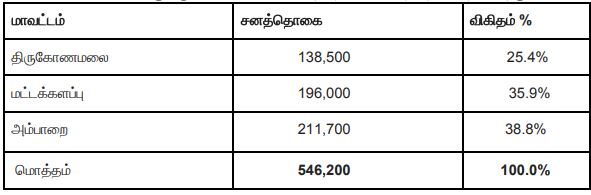 2018 சனத்தொகை புள்ளிவிபரத்தின் படி கிழக்கில் உள்ள முன்று மாவட்டங்களின் சனத்தொகை விபரம் மாவட்ட அடிப்படையில் பின் வருமாறு அமைந்துள்ளது