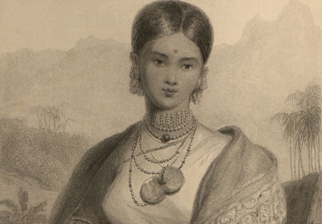 The portrait we see today was originally painted by the English artist William Daniel (1749 – 1840). Old descriptions say that she was very young and extremely pretty and was excited to see herself being transformed into a work of art on paper. It is also said that she was graceful and elegant, perfect as a queen. Studying the portrait, one can see that she is seated on a chair, against a mountainous landscape. She seems to be draped in a saree, and a thick shawl wrapped covering her shoulders. The jacket she is wearing has long sleeves. She is wearing several decorated neckpieces, earrings, and a small tilak on her forehead. Her hair is tied and adorned with flowers.