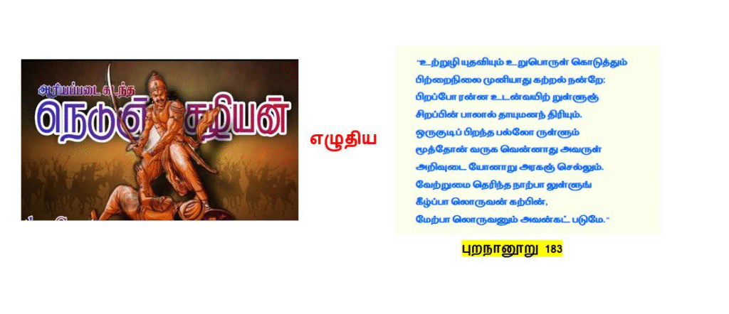 `தமிழன் என்றோர் இனமுண்டு, தனியே அவர்க்கொரு குணமுண்டு` எனப் பாடுவார் நாமக்கல் கவிஞர் வெ . இராமலிங்கம்; தமிழனின் பண்பாடு தனித்துவமானது, குறிப்பாக ஆரியப் பண்பாட்டிலிருந்து வேறுபட்டது. இதனை நிறுவுவதற்கு நாம் நிறையச் சான்றுகளை அடுக்க வேண்டியதில்லை, ஒரேயொரு சங்க காலப் பாடல் போதும். ஆரியப்படை கடந்த நெடுஞ்செழியன் பாடிய பாடல் ஒன்றே போதும். இதோ அவன் பாடிய புறநானூறு 183 ஆவது பாடல்![]()