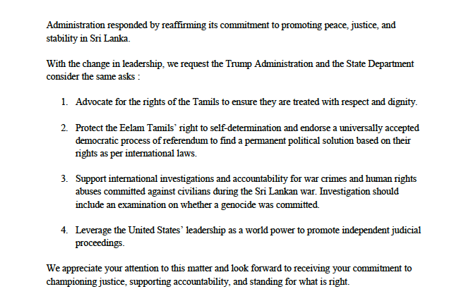 அந்த கடிதத்தில் தமிழ் மக்களுக்கு எதிரான போரின் போது நடந்த அட்டூழியங்களின் வலிமிகுந்த நினைவூட்டல் என விவரிக்கப்பட்டுள்ளது.