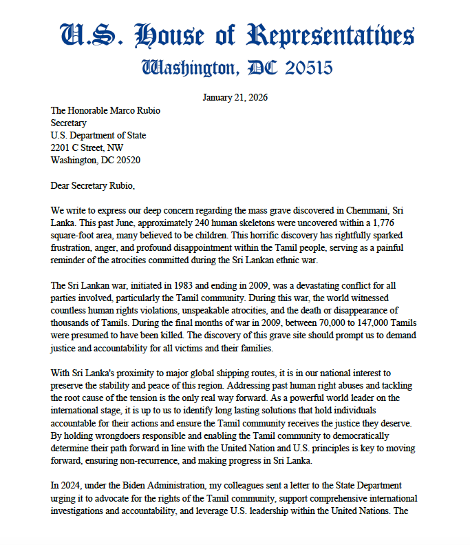 ஜனவரி 21, 2026 திகதியிட்ட அமெரிக்க வெளியுறவுத்துறை செயலாளர் மார்கோ ரூபியோவுக்கு அனுப்பப்பட்ட இந்தக் கடிதம், “செம்மானியில் கண்டுபிடிக்கப்பட்ட மனிதப் புதைகுழி குறித்து ஆழ்ந்த கவலையை” வெளிப்படுத்துகிறது.